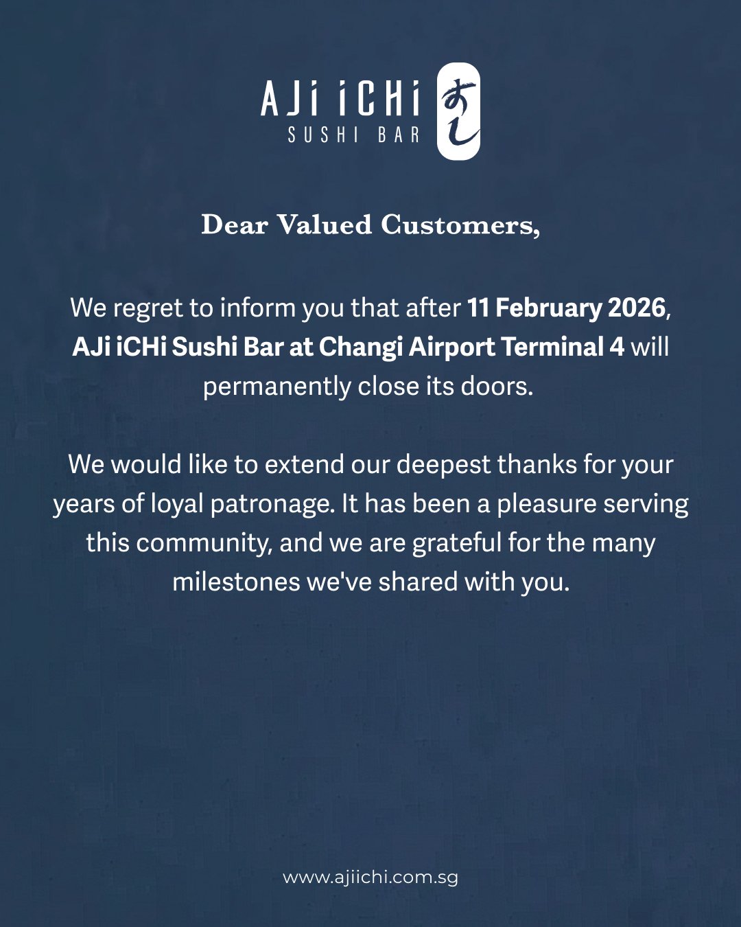 We regret to inform you that after 11 February 2026, we will permanently close our doors at Changi Airport T4.